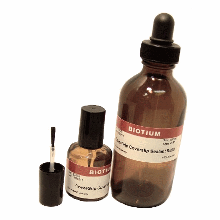 CoverGrip Coverslip Sealant is the first product specifically designed for sealing the edges of wet-mounted coverslips for fluorescence microscopy. Unlike nail polish, CoverGrip Coverslip Sealant contains no ingredients that can leach into aqueous mounting medium and affect specimen fluorescence. CoverGrip Coverslip Sealant is made with d-limonene, a natural, environmentally-friendly solvent with a pleasant citrus aroma, and dries to form a clear, hard, durable seal along the edges of the coverslip. Available in 15 mL brush-cap applicator bottles (23005) or in 100 mL dropper-cap refill bottles (23005-1).