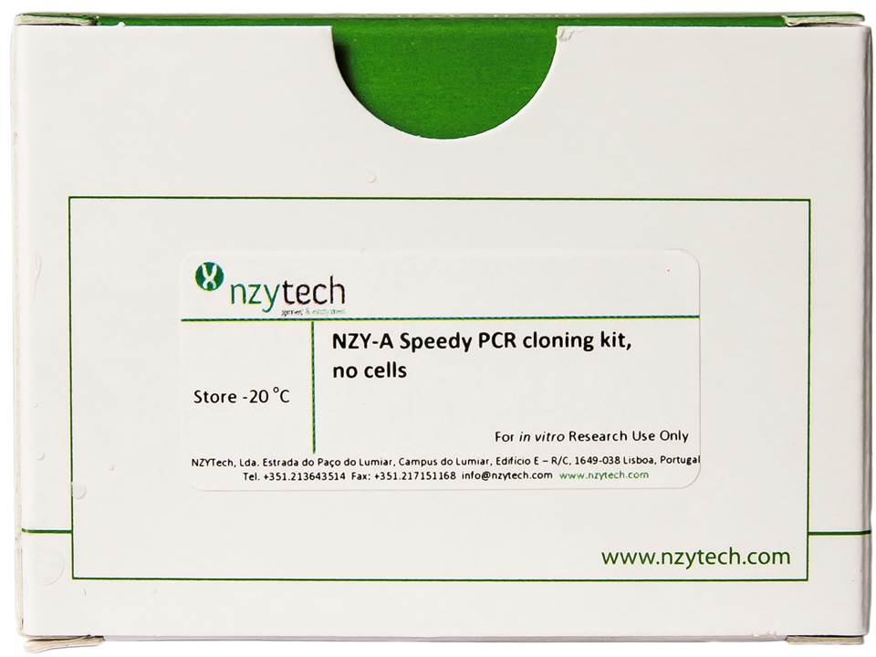 Description: NZY-A Speedy PCR cloning kit was designed to carry out fast and efficient cloning of PCR products with 3´-A overhangs, which result from amplifications using non-proofreading DNA polymerases such as NZYTaq DNA polymerase. This methodology combines the efficiency of an improved ligation buffer with the speed of Speedy Ligase to allow a rapid ligation between the vector and the PCR product in only 5 minutes at room temperature (18-25 °C). The cloning vector was prepared by cutting NZYTech´s pNZY28 with EcoR V and adding a 3´ terminal thymidine at both ends. These single 3´-T overhangs improve the efficiency of ligation of a PCR product into plasmids by preventing recircularization of the vector and providing compatible overhangs for PCR products generated by non-proofreading thermostable polymerases. Vector pNZY28 contains multiple restriction sites within the multiple cloning region. However, vector digestion with EcoR I or BamH I allows the release of the PCR product since the vector cloning region is flanked by recognition sites of both enzymes.